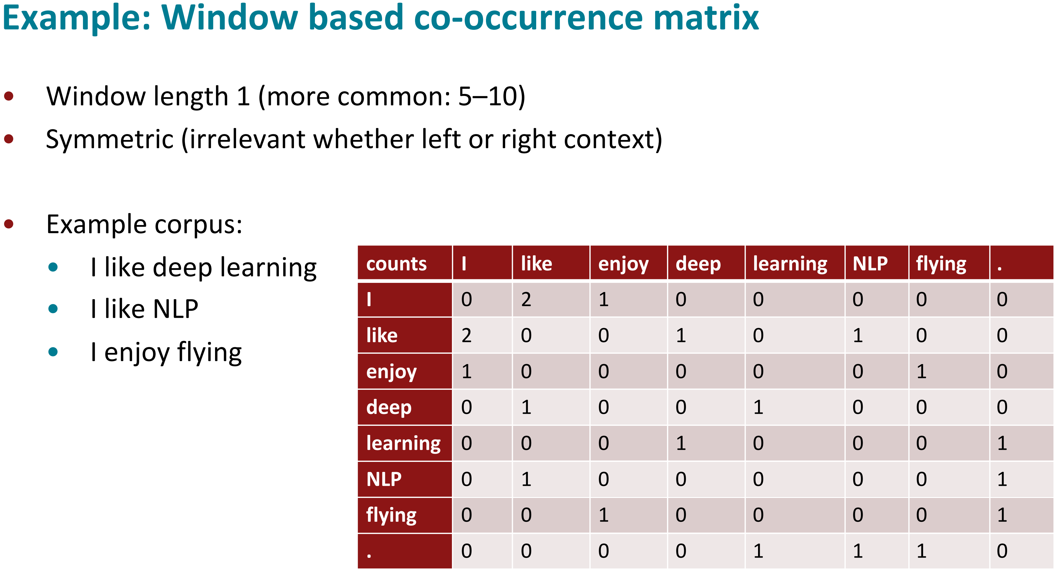 - 共现矩阵 \(X\) 每一行的和 \(X_{i}\) 表示整个语料库一共有多少单词出现在单词 \(i\) 附近