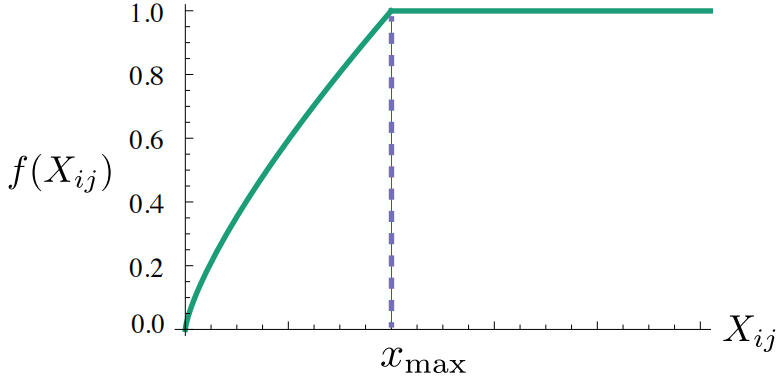 其中 \(x_{\max}\) 是设置的共现次数的阈值,作者根据语料库统计设置为 100,\(\alpha\) 是超参数,作者根据实验效果设置为 0.75